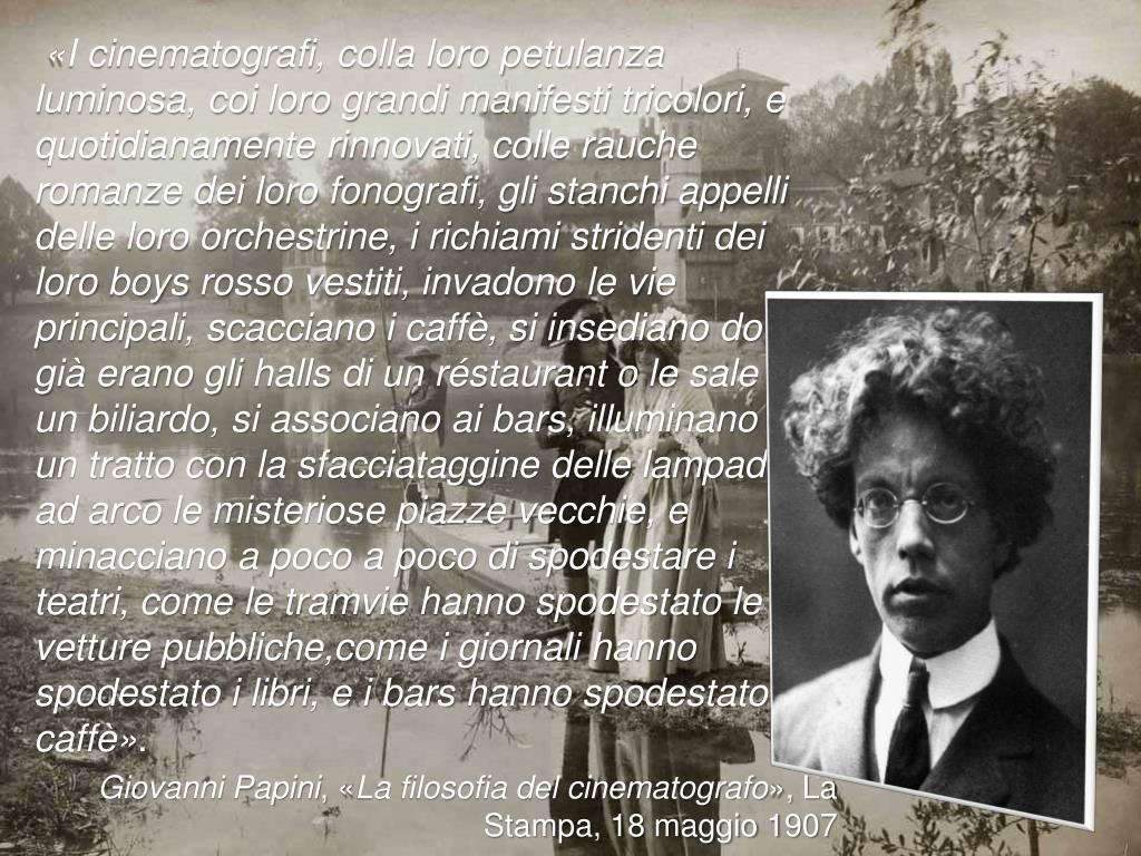 «I cinematografi, colla loro petulanza luminosa, coi loro grandi manifesti tricolori, e quotidianamente rinnovati, colle rauche romanze dei loro fonografi, gli stanchi appelli delle loro orchestrine, i richiami stridenti dei loro boys rosso vestiti, invadono le vie principali, scacciano i caffè, si insediano dove già erano gli halls di un réstaurant o le sale di un biliardo, si associano ai bars, illuminano ad un tratto con la sfacciataggine delle lampade ad arco le misteriose piazze vecchie, e minacciano a poco a poco di spodestare i teatri, come le tramvie hanno spodestato le vetture pubbliche,come i giornali hanno spodestato i libri, e i bars hanno spodestato i caffè». • Giovanni Papini, «La filosofia del cinematografo», La Stampa, 18 maggio 1907