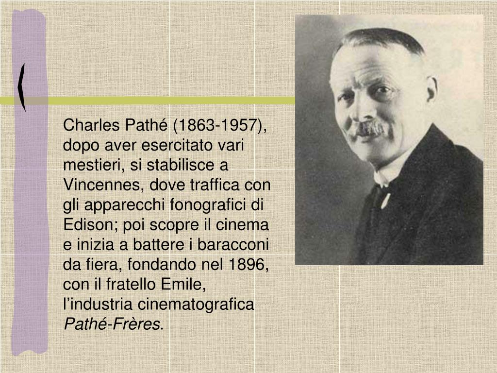 Charles Pathé (1863-1957), dopo aver esercitato vari mestieri, si stabilisce a Vincennes, dove traffica con gli apparecchi fonografici di Edison; poi scopre il cinema e inizia a battere i baracconi da fiera, fondando nel 1896, con il fratello Emile, l’industria cinematografica Pathé-Frères.