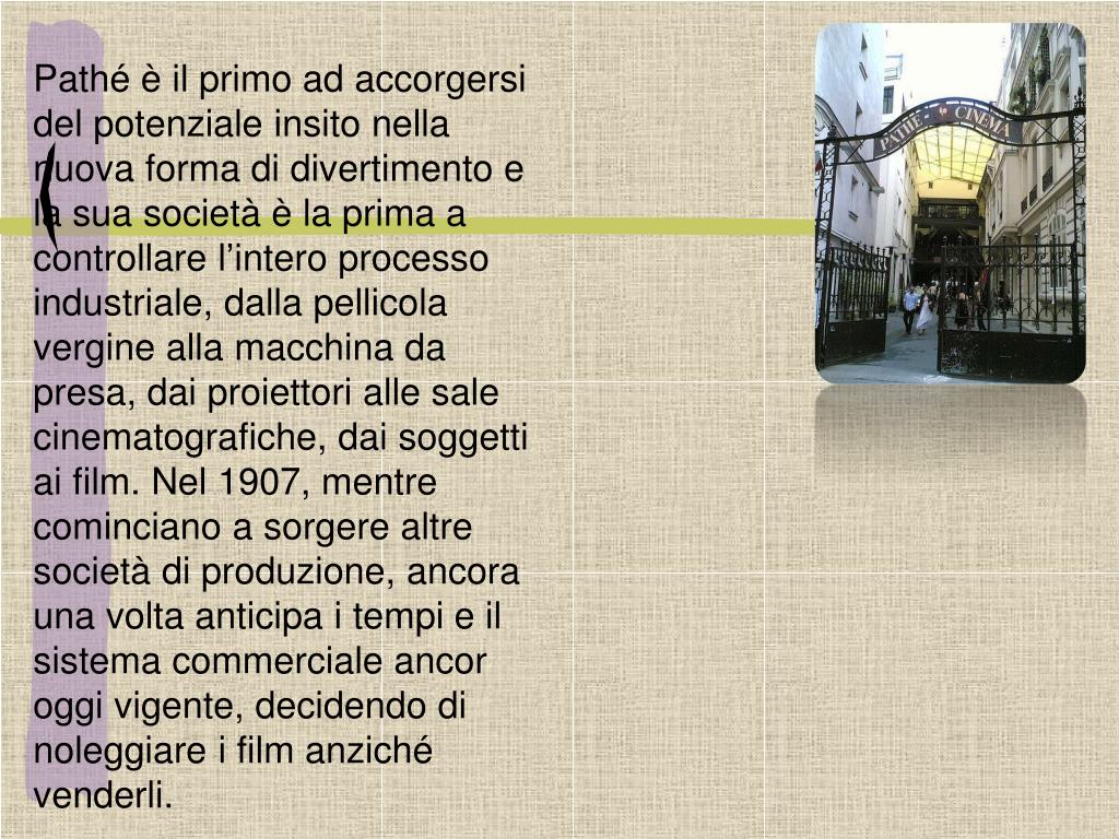 Pathé è il primo ad accorgersi del potenziale insito nella nuova forma di divertimento e la sua società è la prima a controllare l’intero processo industriale, dalla pellicola vergine alla macchina da presa, dai proiettori alle sale cinematografiche, dai soggetti ai film. Nel 1907, mentre cominciano a sorgere altre società di produzione, ancora una volta anticipa i tempi e il sistema commerciale ancor oggi vigente, decidendo di noleggiare i film anziché venderli.
