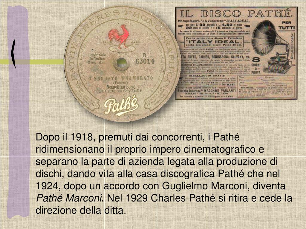 Dopo il 1918, premuti dai concorrenti, i Pathé ridimensionano il proprio impero cinematografico e separano la parte di azienda legata alla produzione di dischi, dando vita alla casa discografica Pathé che nel 1924, dopo un accordo con Guglielmo Marconi, diventa Pathé Marconi. Nel 1929 Charles Pathé si ritira e cede la direzione della ditta.