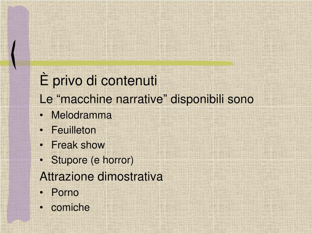 È privo di contenuti • Le “macchine narrative” disponibili sono • Melodramma • Feuilleton • Freak show • Stupore (e horror) • Attrazione dimostrativa • Porno • comiche