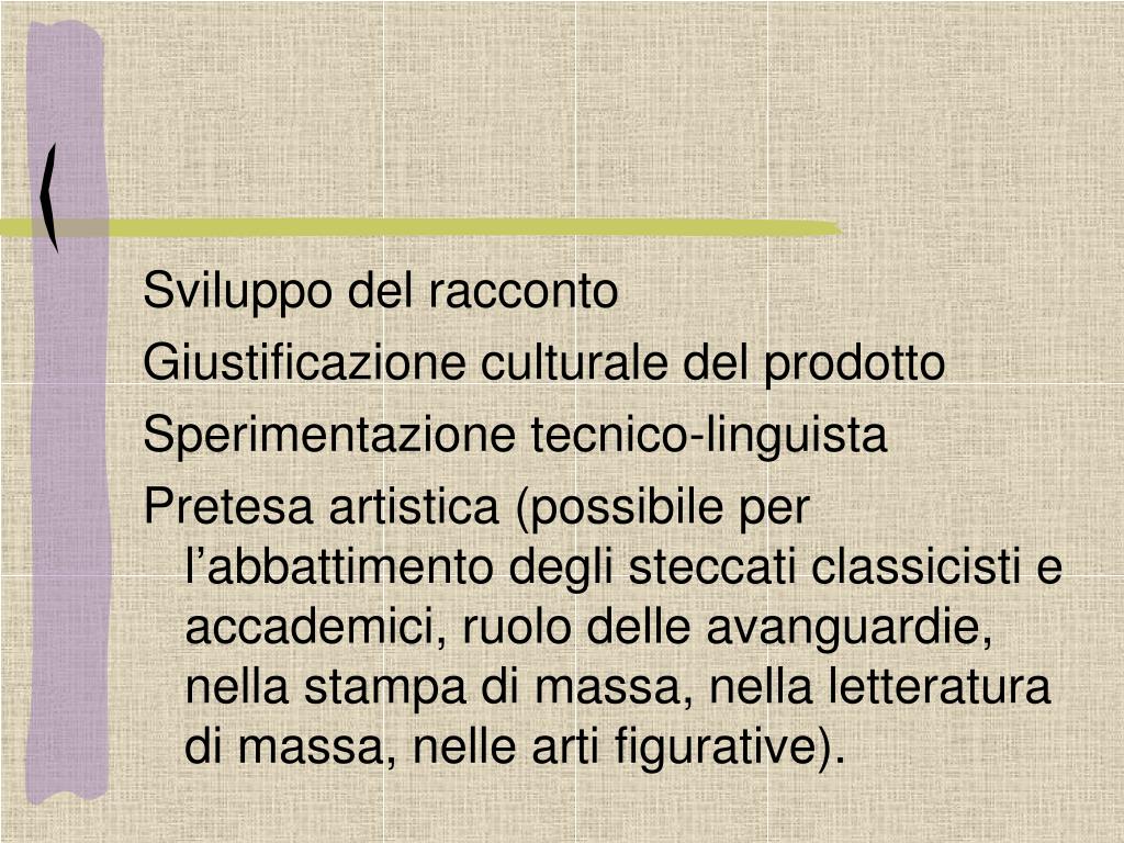 Sviluppo del racconto • Giustificazione culturale del prodotto • Sperimentazione tecnico-linguista • Pretesa artistica (possibile per l’abbattimento degli steccati classicisti e accademici, ruolo delle avanguardie, nella stampa di massa, nella letteratura di massa, nelle arti figurative).