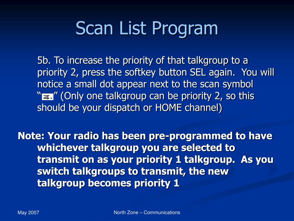 Scan List Program 5b. To increase the priority of that talkgroup to a priority 2, press the softkey button SEL again. You will notice a small dot appear next to the scan symbol “ ” (Only one talkgroup can be priority 2, so this should be your dispatch or HOME channel) Note: Your radio has been pre-programmed to have whichever talkgroup you are selected to transmit on as your priority 1 talkgroup. As you switch talkgroups to transmit, the new talkgroup becomes priority 1 North Zone – Communications