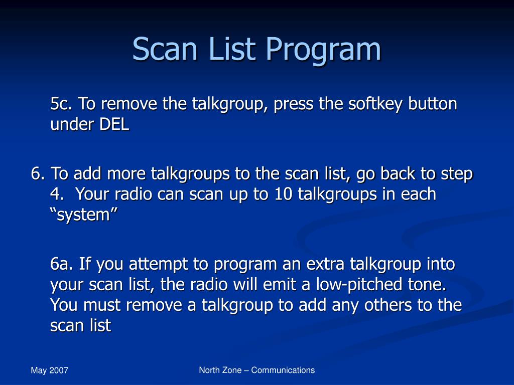 Scan List Program 5c. To remove the talkgroup, press the softkey button under DEL 6. To add more talkgroups to the scan list, go back to step 4. Your radio can scan up to 10 talkgroups in each “system” 6a. If you attempt to program an extra talkgroup into your scan list, the radio will emit a low-pitched tone. You must remove a talkgroup to add any others to the scan list North Zone – Communications