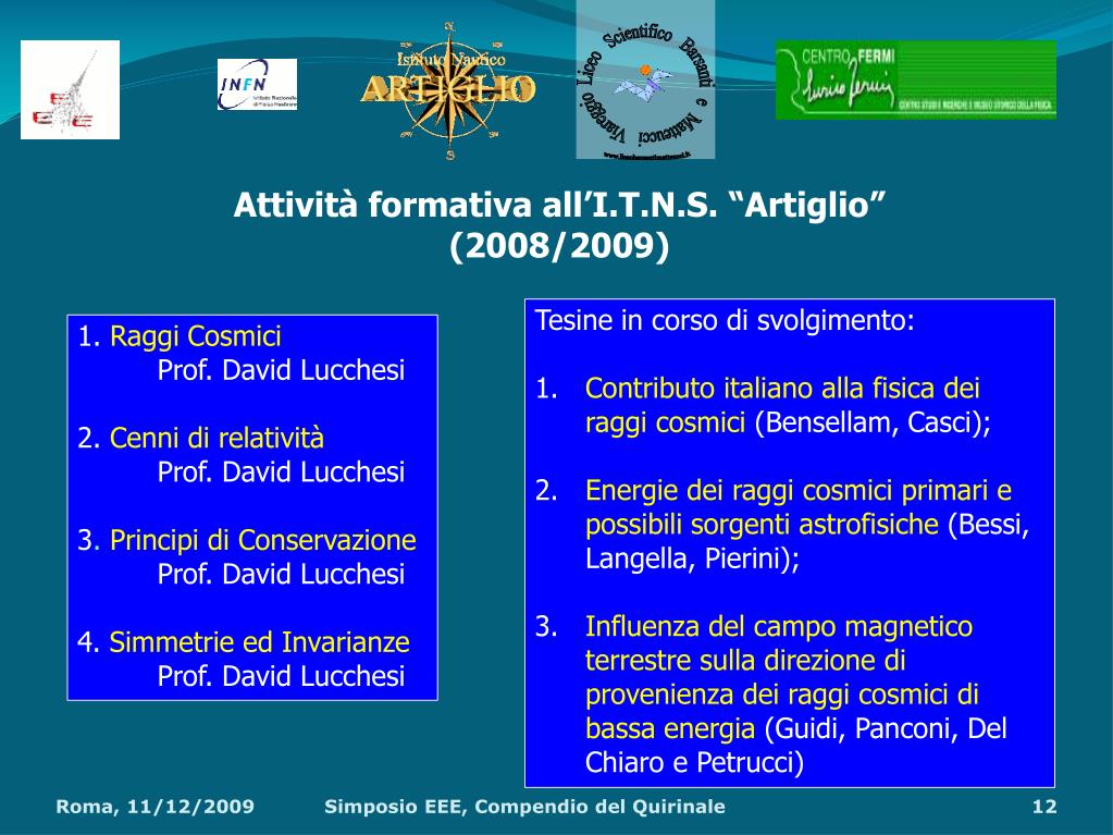 Attività formativa all’I.T.N.S. “Artiglio” (2008/2009) Tesine in corso di svolgimento: Contributo italiano alla fisica dei raggi cosmici (Bensellam, Casci); Energie dei raggi cosmici primari e possibili sorgenti astrofisiche (Bessi, Langella, Pierini); Influenza del campo magnetico terrestre sulla direzione di provenienza dei raggi cosmici di bassa energia (Guidi, Panconi, Del Chiaro e Petrucci) 1. Raggi Cosmici Prof. David Lucchesi 2. Cenni di relatività Prof. David Lucchesi 3. Principi di Conservazione Prof. David Lucchesi 4. Simmetrie ed Invarianze Prof. David Lucchesi Simposio EEE, Compendio del Quirinale