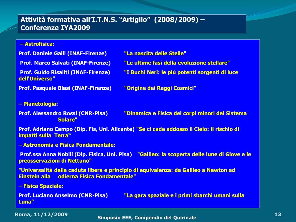Attività formativa all’I.T.N.S. “Artiglio” (2008/2009) – Conferenze IYA2009 – Astrofisica: Prof. Daniele Galli (INAF-Firenze) "La nascita delle Stelle" Prof. Marco Salvati (INAF-Firenze) "Le ultime fasi della evoluzione stellare" Prof. Guido Risaliti (INAF-Firenze) "I Buchi Neri: le più potenti sorgenti di luce dell'Universo" Prof. Pasquale Blasi (INAF-Firenze)"Origine dei Raggi Cosmici" – Planetologia: Prof. Alessandro Rossi (CNR-Pisa) "Dinamica e Fisica dei corpi minori del Sistema Solare" Prof. Adriano Campo (Dip. Fis, Uni. Alicante) "Se ci cade addosso il Cielo: il rischio di impatti sulla Terra“ – Astronomia e Fisica Fondamentale: Prof.ssa Anna Nobili (Dip. Fisica, Uni. Pisa) "Galileo: la scoperta delle lune di Giove e le preosservazioni di Nettuno“ "Universalità della caduta libera e principio di equivalenza: da Galileo a Newton ad Einstein alla odierna Fisica Fondamentale" – Fisica Spaziale: Prof. Luciano Anselmo (CNR-Pisa)"La gara spaziale e i primi sbarchi umani sulla Luna” Simposio EEE, Compendio del Quirinale Simposio EEE, Compendio del Quirinale