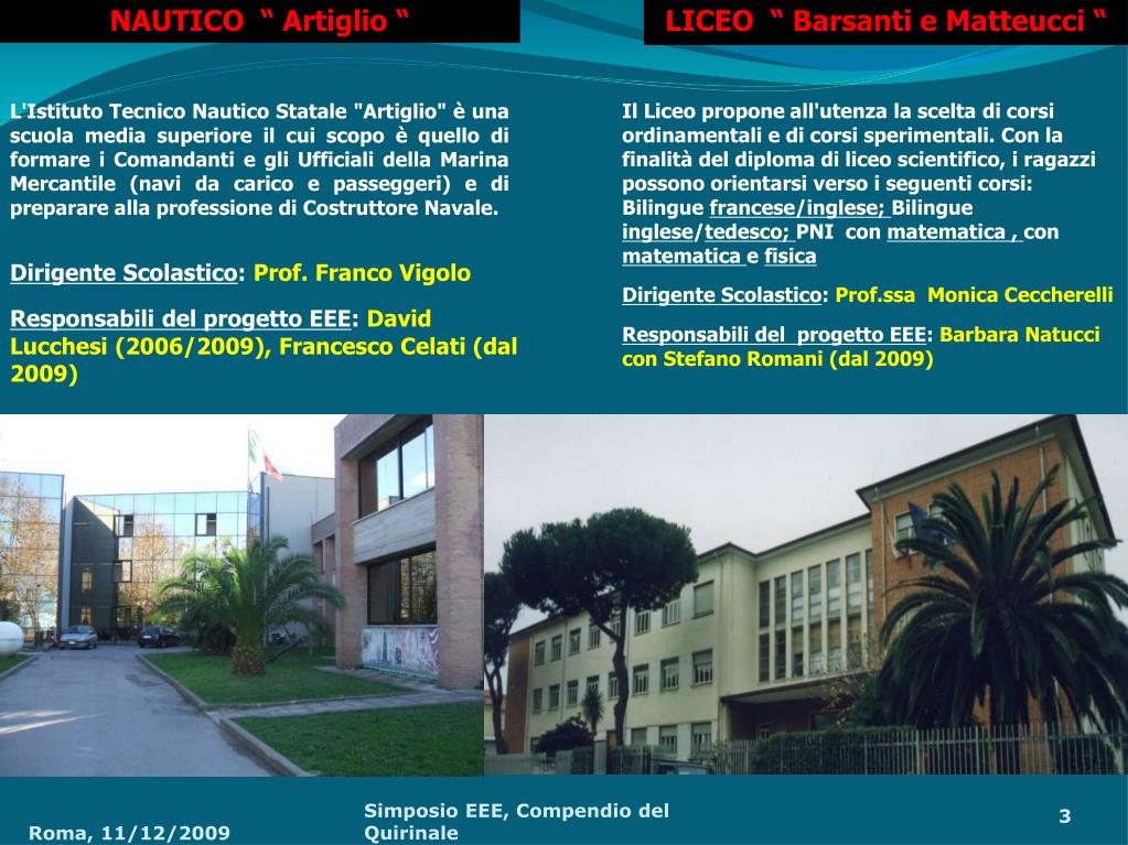 NAUTICO “ Artiglio “ LICEO “ Barsanti e Matteucci “ L'Istituto Tecnico Nautico Statale "Artiglio" è una scuola media superiore il cui scopo è quello di formare i Comandanti e gli Ufficiali della Marina Mercantile (navi da carico e passeggeri) e di preparare alla professione di Costruttore Navale. Il Liceo propone all'utenza la scelta di corsi ordinamentali e di corsi sperimentali. Con la finalità del diploma di liceo scientifico, i ragazzi possono orientarsi verso i seguenti corsi: Bilingue francese/inglese; Bilingue inglese/tedesco; PNI con matematica , con matematica e fisica Dirigente Scolastico: Prof. Franco Vigolo Responsabili del progetto EEE: David Lucchesi (2006/2009), Francesco Celati (dal 2009) Dirigente Scolastico: Prof.ssa Monica Ceccherelli Responsabili del progetto EEE: Barbara Natucci con Stefano Romani (dal 2009) Simposio EEE, Compendio del Quirinale