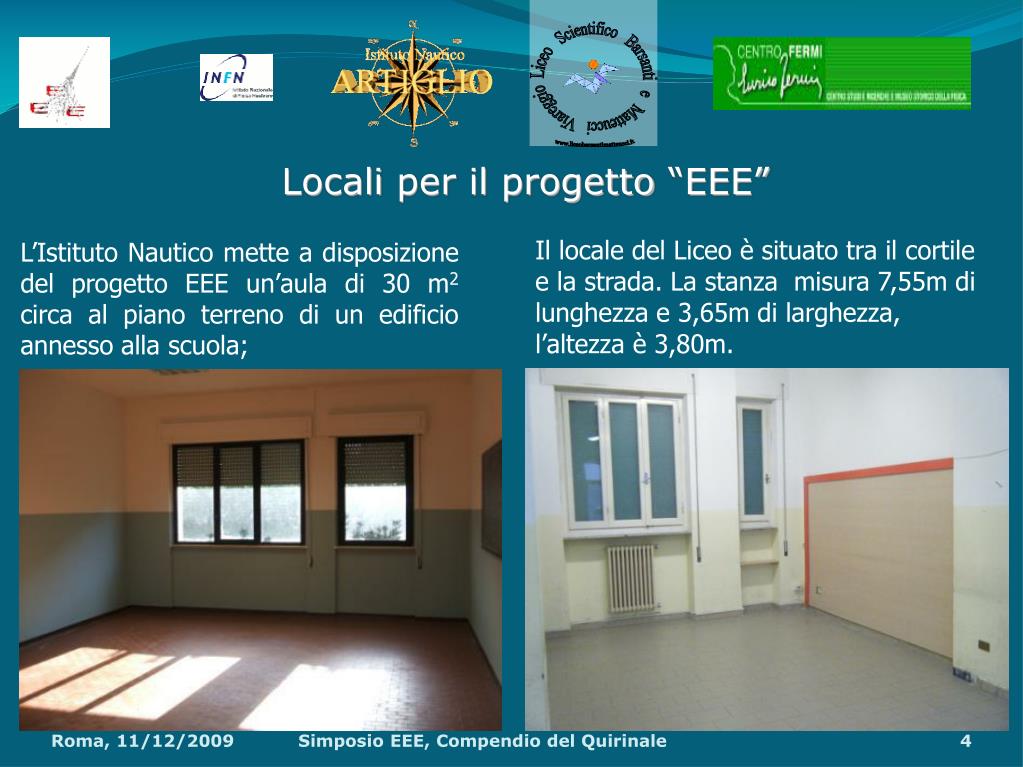 Locali per ilprogetto “EEE” L’Istituto Nautico mette a disposizione del progetto EEE un’aula di 30 m2 circa al piano terreno di un edificio annesso alla scuola; Il locale del Liceo è situato tra il cortile e la strada. La stanza misura 7,55m di lunghezza e 3,65m di larghezza, l’altezza è 3,80m. Simposio EEE, Compendio del Quirinale
