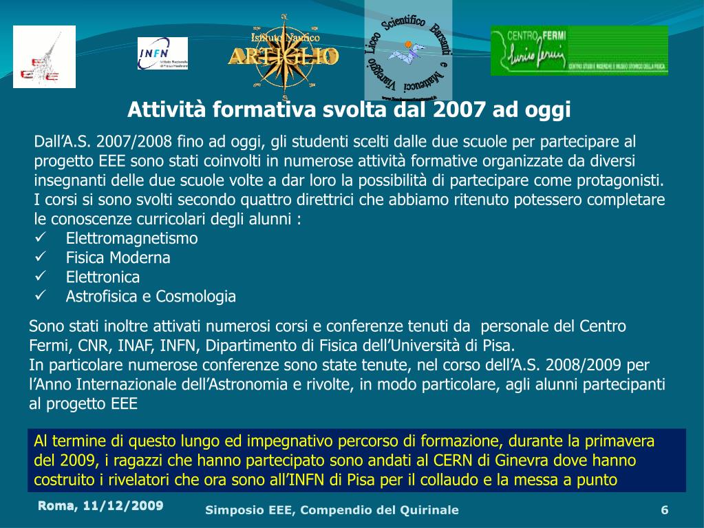 Attività formativa svolta dal 2007 ad oggi • Dall’A.S. 2007/2008 fino ad oggi, gli studenti scelti dalle due scuole per partecipare al progetto EEE sono stati coinvolti in numerose attività formative organizzate da diversi insegnanti delle due scuole volte a dar loro la possibilità di partecipare come protagonisti. • I corsi si sono svolti secondo quattro direttrici che abbiamo ritenuto potessero completare le conoscenze curricolari degli alunni : • Elettromagnetismo • Fisica Moderna • Elettronica • Astrofisica e Cosmologia Sono stati inoltre attivati numerosi corsi e conferenze tenuti da personale del Centro Fermi, CNR, INAF, INFN, Dipartimento di Fisica dell’Università di Pisa. In particolare numerose conferenze sono state tenute, nel corso dell’A.S. 2008/2009 per l’Anno Internazionale dell’Astronomia e rivolte, in modo particolare, agli alunni partecipanti al progetto EEE Al termine di questo lungo ed impegnativo percorso di formazione, durante la primavera del 2009, i ragazzi che hanno partecipato sono andati al CERN di Ginevra dove hanno costruito i rivelatori che ora sono all’INFN di Pisa per il collaudo e la messa a punto Roma, 11/12/2009 Simposio EEE, Compendio del Quirinale