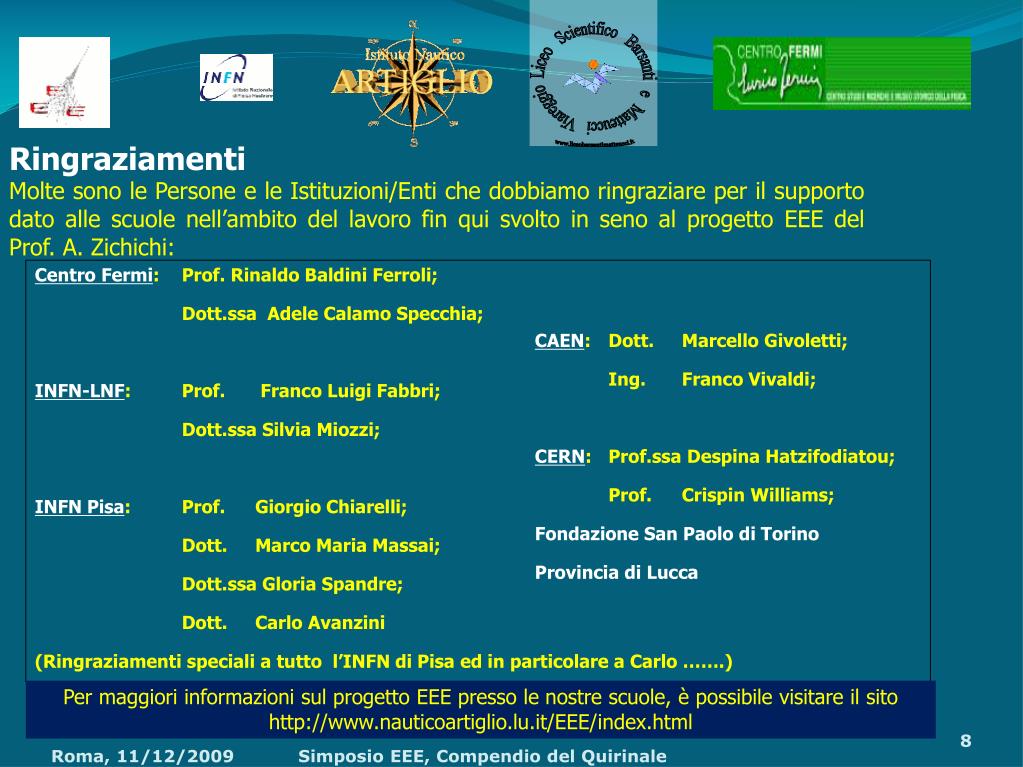 Ringraziamenti Molte sono le Persone e le Istituzioni/Enti che dobbiamo ringraziare per il supporto dato alle scuole nell’ambito del lavoro fin qui svolto in seno al progetto EEE del Prof. A. Zichichi: Centro Fermi: Prof. Rinaldo Baldini Ferroli; Dott.ssa Adele Calamo Specchia; INFN-LNF: Prof. Franco Luigi Fabbri; Dott.ssa Silvia Miozzi; INFN Pisa: Prof. Giorgio Chiarelli; Dott. Marco Maria Massai; Dott.ssa Gloria Spandre; Dott. Carlo Avanzini (Ringraziamenti speciali a tutto l’INFN di Pisa ed in particolare a Carlo …….) CAEN: Dott. Marcello Givoletti; Ing. Franco Vivaldi; CERN: Prof.ssa Despina Hatzifodiatou; Prof. Crispin Williams; Fondazione San Paolo di Torino Provincia di Lucca Per maggiori informazioni sul progetto EEE presso le nostre scuole, è possibile visitare il sito http://www.nauticoartiglio.lu.it/EEE/index.html Simposio EEE, Compendio del Quirinale
