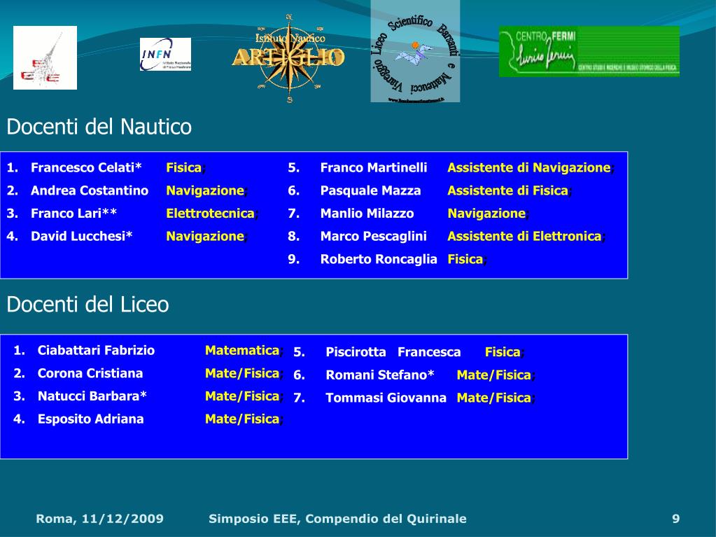 Francesco Celati*Fisica; • Andrea Costantino Navigazione; • Franco Lari** Elettrotecnica; • David Lucchesi* Navigazione; • Ciabattari FabrizioMatematica; • Corona CristianaMate/Fisica; • Natucci Barbara*Mate/Fisica; • Esposito AdrianaMate/Fisica; • Franco MartinelliAssistente di Navigazione; • Pasquale MazzaAssistente di Fisica; • Manlio Milazzo Navigazione; • Marco PescagliniAssistente di Elettronica; • Roberto RoncagliaFisica; • Piscirotta FrancescaFisica; • Romani Stefano* Mate/Fisica; • Tommasi GiovannaMate/Fisica; Docenti del Nautico Docenti del Liceo Simposio EEE, Compendio del Quirinale
