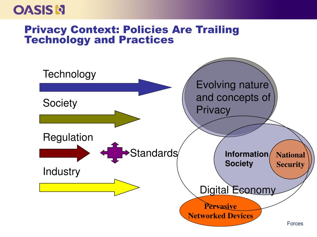 Privacy Context: Policies Are Trailing Technology and Practices Technology Evolving nature and concepts of Privacy Society Regulation National Security Standards Information Society Industry Digital Economy Pervasive Networked Devices Forces