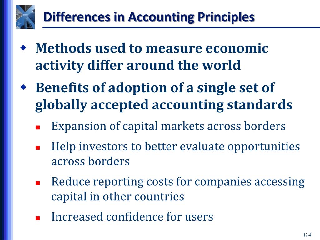 Differences in Accounting Principles • Methods used to measure economic activity differ around the world • Benefits of adoption of a single set of globally accepted accounting standards • Expansion of capital markets across borders • Help investors to better evaluate opportunities across borders • Reduce reporting costs for companies accessing capital in other countries • Increased confidence for users