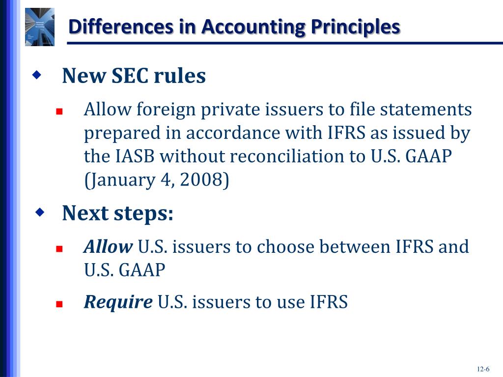 Differences in Accounting Principles • New SEC rules • Allow foreign private issuers to file statements prepared in accordance with IFRS as issued by the IASB without reconciliation to U.S. GAAP (January 4, 2008) • Next steps: • Allow U.S. issuers to choose between IFRS and U.S. GAAP • Require U.S. issuers to use IFRS