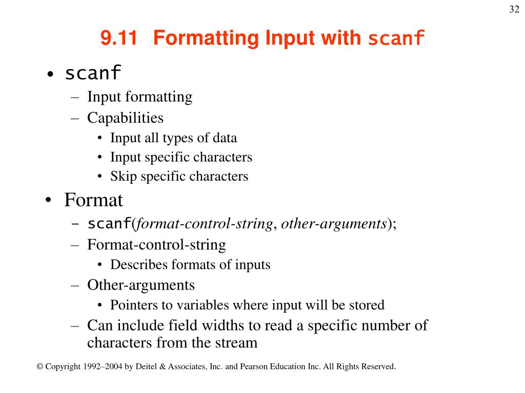 9.11 Formatting Input with scanf • scanf • Input formatting • Capabilities • Input all types of data • Input specific characters • Skip specific characters • Format • scanf(format-control-string, other-arguments); • Format-control-string • Describes formats of inputs • Other-arguments • Pointers to variables where input will be stored • Can include field widths to read a specific number of characters from the stream