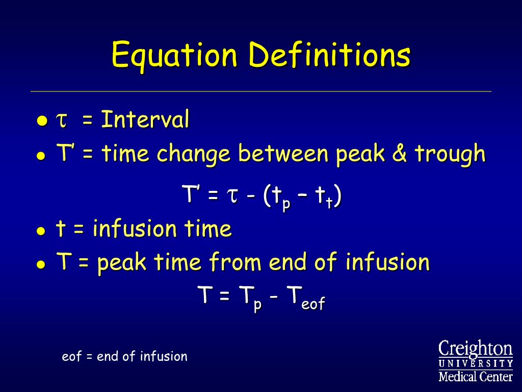 Equation Definitions • = Interval • T’ = time change between peak & trough T’ = - (tp – tt) • t = infusion time • T = peak time from end of infusion T = Tp - Teof eof = end of infusion