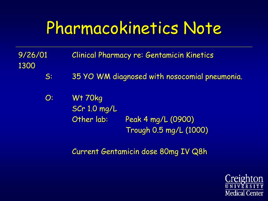 Pharmacokinetics Note 9/26/01 Clinical Pharmacy re: Gentamicin Kinetics 1300 S: 35 YO WM diagnosed with nosocomial pneumonia. O: Wt 70kg SCr 1.0 mg/L Other lab: Peak 4 mg/L (0900) Trough 0.5 mg/L (1000) Current Gentamicin dose 80mg IV Q8h