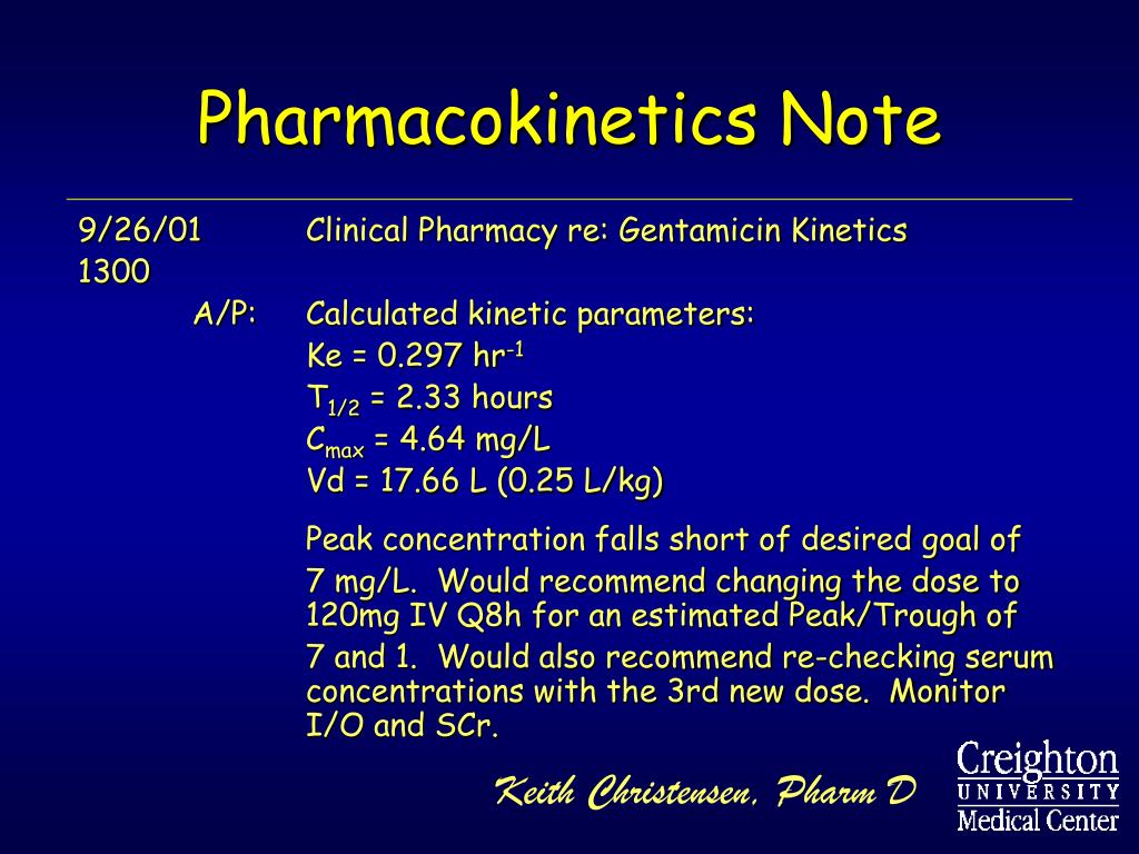 Pharmacokinetics Note 9/26/01 Clinical Pharmacy re: Gentamicin Kinetics 1300 A/P: Calculated kinetic parameters: Ke = 0.297 hr-1 T1/2 = 2.33 hours Cmax = 4.64 mg/L Vd = 17.66 L (0.25 L/kg) Peak concentration falls short of desired goal of 7 mg/L. Would recommend changing the dose to 120mg IV Q8h for an estimated Peak/Trough of 7 and 1. Would also recommend re-checking serum concentrations with the 3rd new dose. Monitor I/O and SCr. Keith Christensen, Pharm D