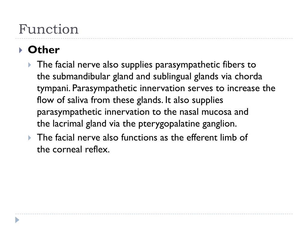 Function • Other • The facial nerve also supplies parasympathetic fibers to the submandibular gland and sublingual glands via chorda tympani. Parasympathetic innervation serves to increase the flow of saliva from these glands. It also supplies parasympathetic innervation to the nasal mucosa and the lacrimal gland via the pterygopalatine ganglion. • The facial nerve also functions as the efferent limb of the corneal reflex.
