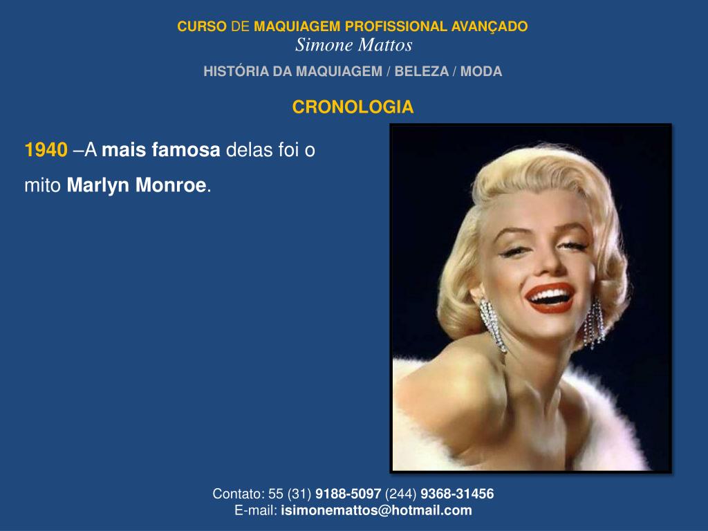 CURSO DE MAQUIAGEMPROFISSIONAL AVANÇADO Simone Mattos HISTÓRIA DA MAQUIAGEM / BELEZA / MODA CRONOLOGIA 1940 –A mais famosa delas foi o mito Marlyn Monroe. Contato: 55 (31) 9188-5097 (244) 9368-31456 E-mail: isimonemattos@hotmail.com