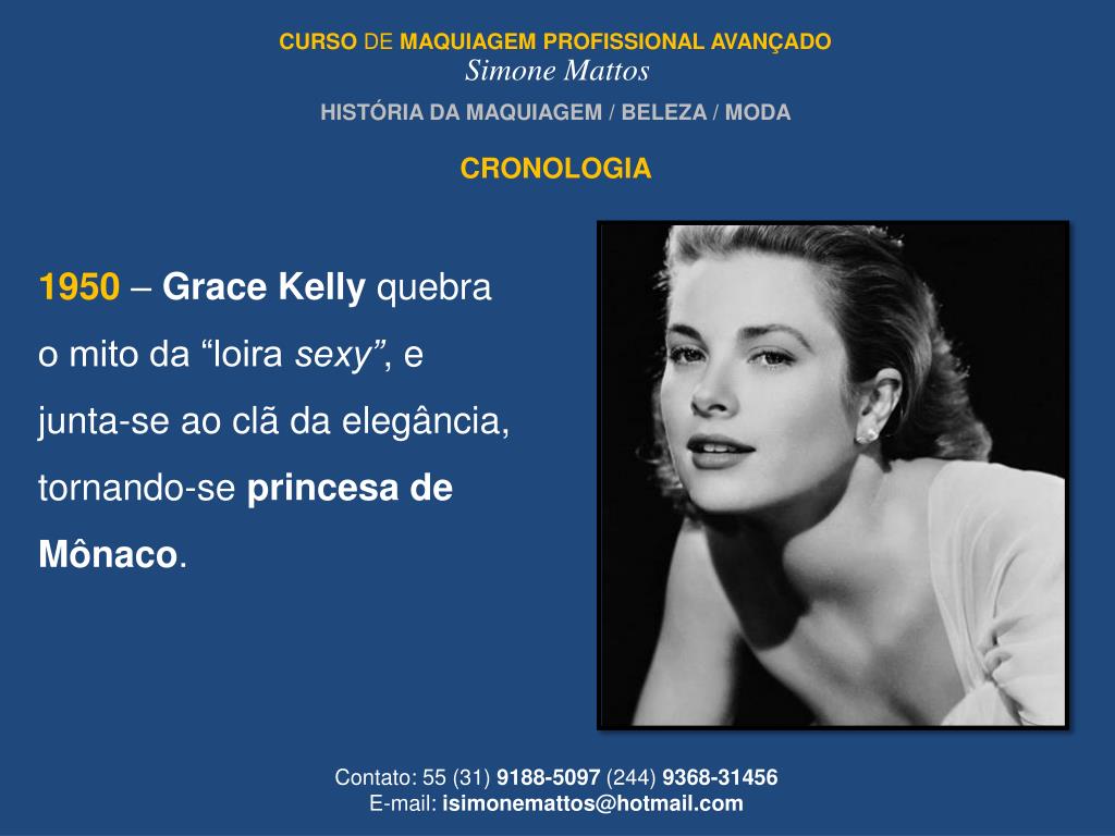 CURSO DE MAQUIAGEMPROFISSIONAL AVANÇADO Simone Mattos HISTÓRIA DA MAQUIAGEM / BELEZA / MODA CRONOLOGIA 1950 – Grace Kelly quebra o mito da “loira sexy”, e junta-se ao clã da elegância, tornando-se princesa de Mônaco. Contato: 55 (31) 9188-5097 (244) 9368-31456 E-mail: isimonemattos@hotmail.com