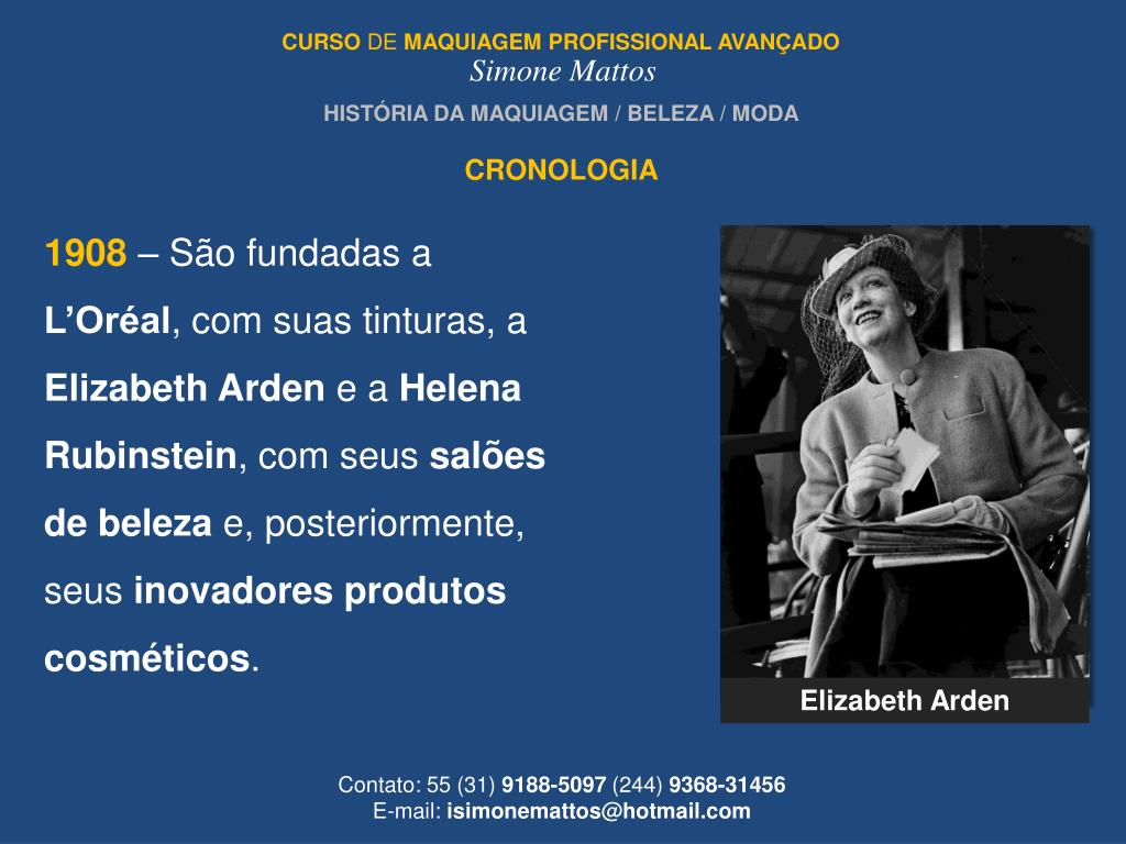 CURSO DE MAQUIAGEMPROFISSIONAL AVANÇADO Simone Mattos HISTÓRIA DA MAQUIAGEM / BELEZA / MODA CRONOLOGIA 1908 – São fundadas a L’Oréal, com suas tinturas, a Elizabeth Ardene a Helena Rubinstein, com seus salões de beleza e, posteriormente, seus inovadores produtos cosméticos. Elizabeth Arden Contato: 55 (31) 9188-5097 (244) 9368-31456 E-mail: isimonemattos@hotmail.com