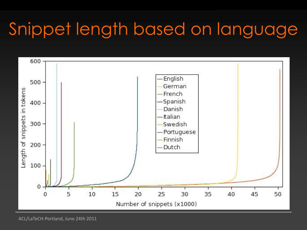 Pre-processing • EAD/XML element selection & extraction • EAD elements containing free-text & archive content information • Language identification (n-gram method) • Identifier trained on Europarl corpus • Text snippets length: ~20 tokens