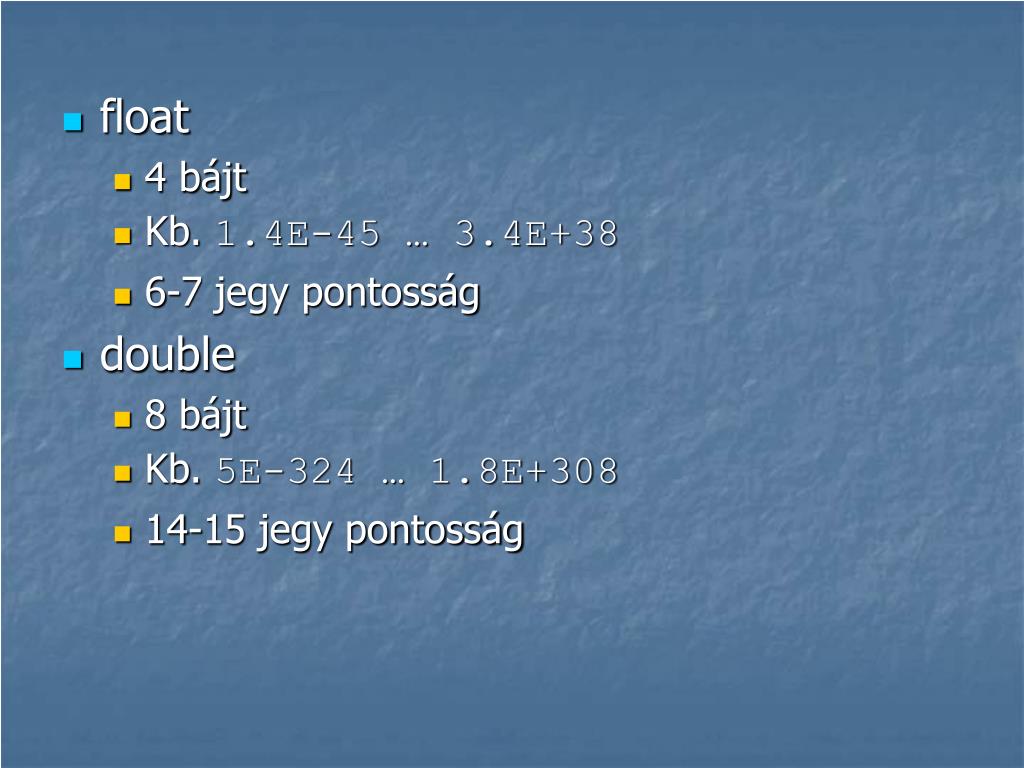 float • 4 bájt • Kb. 1.4E-45 … 3.4E+38 • 6-7 jegy pontosság • double • 8 bájt • Kb. 5E-324 … 1.8E+308 • 14-15 jegy pontosság