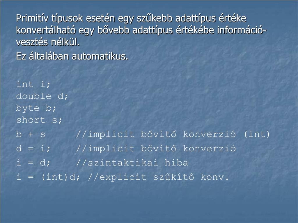 Primitív típusok esetén egy szűkebb adattípus értéke konvertálható egy bővebb adattípus értékébe információ-vesztés nélkül. Ez általában automatikus. int i;double d;byte b;short s; b + s //implicit bővítő konverzió (int) d = i; //implicit bővítő konverzió i = d; //szintaktikai hiba i = (int)d; //explicit szűkítő konv.