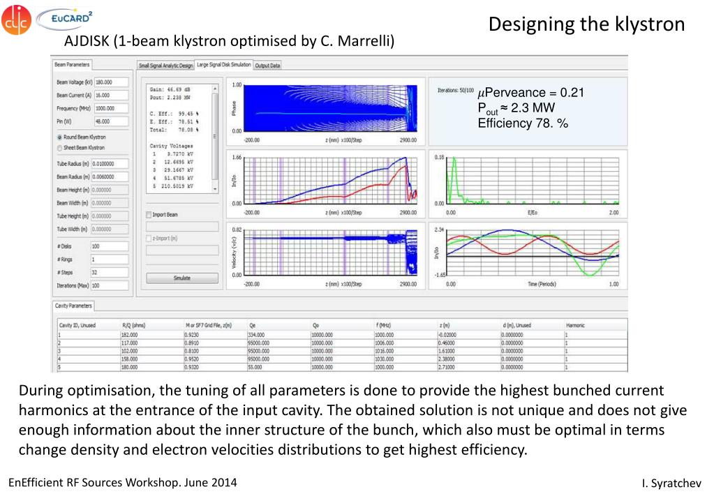 Designing the klystron AJDISK (1-beam klystron optimised by C. Marrelli) 𝜇Perveance = 0.21 Pout ≈ 2.3 MW Efficiency 78. % During optimisation, the tuning of all parameters is done to provide the highest bunched current harmonics at the entrance of the input cavity. The obtained solution is not unique and does not give enough information about the inner structure of the bunch, which also must be optimal in terms change density and electron velocities distributions to get highest efficiency.