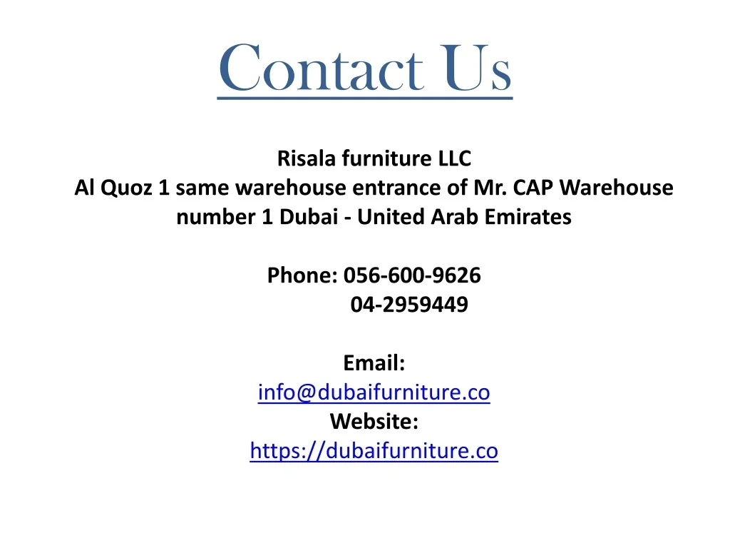 Contact Us Risala furniture LLC Al Quoz 1 same warehouse entrance of Mr. CAP Warehouse number 1 Dubai - United Arab Emirates Phone: 056-600-9626 04-2959449Email: info@dubaifurniture.co Website: https://dubaifurniture.co