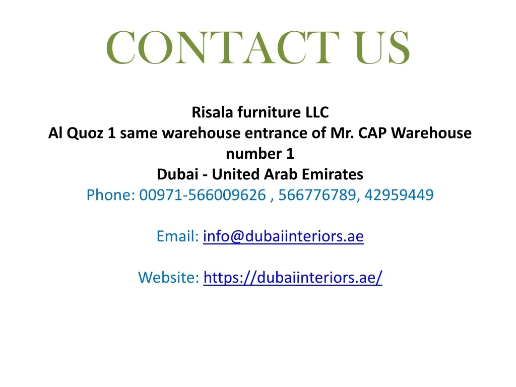 CONTACT US Risala furniture LLCAl Quoz 1 same warehouse entrance of Mr. CAP Warehouse number 1Dubai - United Arab Emirates Phone: 00971-566009626 , 566776789, 42959449 Email: info@dubaiinteriors.ae Website: https://dubaiinteriors.ae/