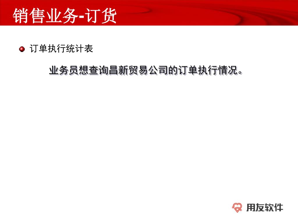 销售业务-订货 • 订单执行统计表 业务员想查询昌新贸易公司的订单执行情况。