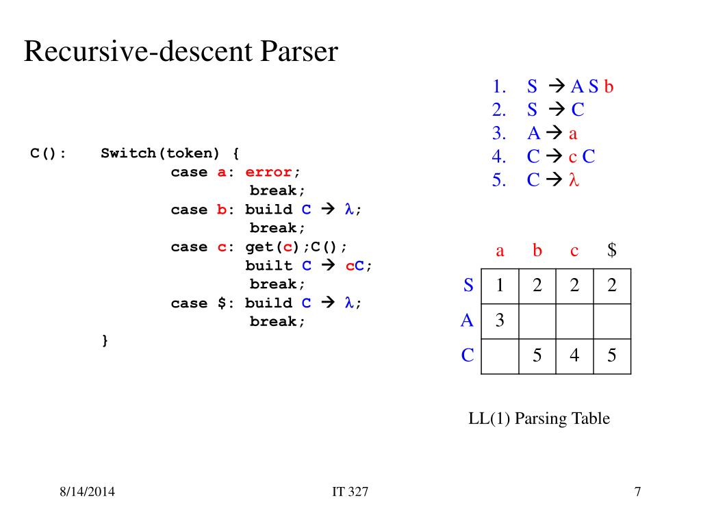 Recursive-descent Parser • S A S b • S C • A a • C c C • C C(): Switch(token) { case a: error; break; case b: build C ; break; case c: get(c);C(); built C cC; break; case $: build C ; break; } LL(1) Parsing Table IT 327