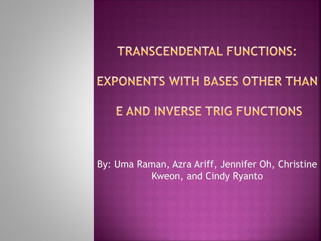 Transcendental Functions:Exponents with Bases other than e and inverse Trig functions By: Uma Raman, AzraAriff, Jennifer Oh, Christine Kweon, and Cindy Ryanto