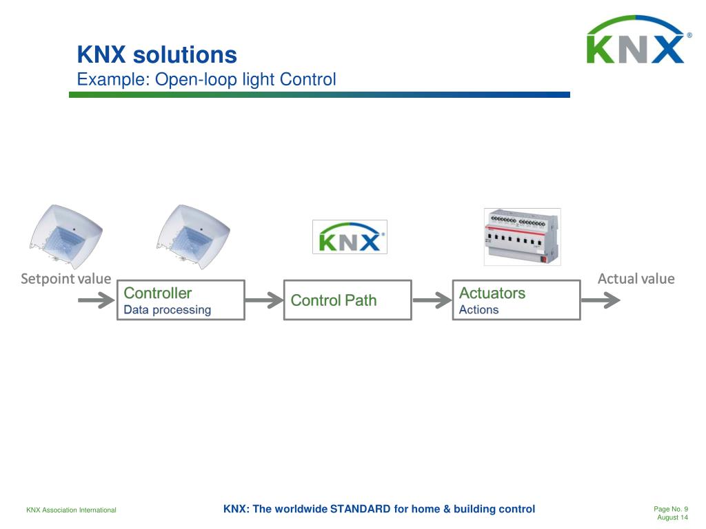 KNX solutionsExample: Open-loop light control • Presence-detectors detect if persons are present in the room • Yes: lights will be switched on • No: lights will be switched of • Application is often used for restrooms in commercial buildings Electrical Energy can be saved
