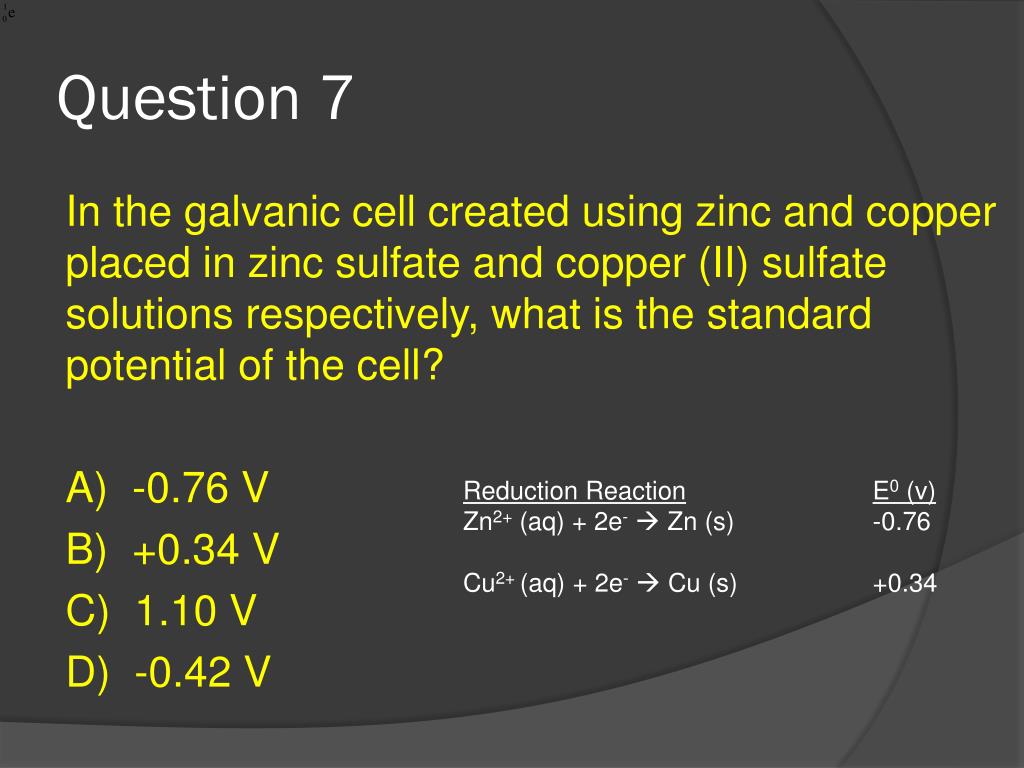 Question 7 In the galvanic cell created using zinc and copper placed in zinc sulfate and copper (II) sulfate solutions respectively, what is the standard potential of the cell? A) -0.76 V B) +0.34 V C) 1.10 V D) -0.42 V Reduction ReactionE0 (v) Zn2+ (aq) + 2e- Zn (s) -0.76 Cu2+ (aq) + 2e- Cu (s) +0.34