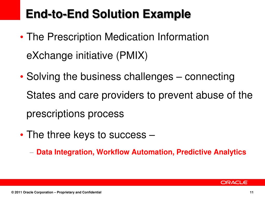 End-to-End Solution Example • The Prescription Medication Information eXchange initiative (PMIX) • Solving the business challenges – connecting States and care providers to prevent abuse of the prescriptions process • The three keys to success – • Data Integration, Workflow Automation, Predictive Analytics