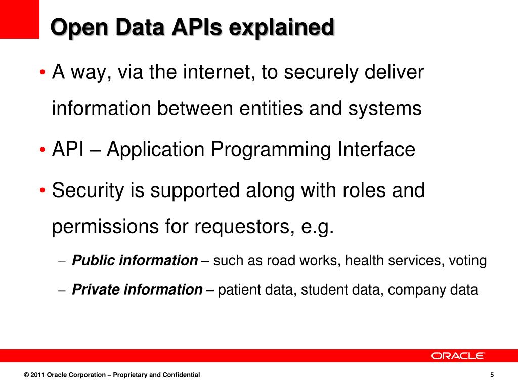 Open Data APIs explained • A way, via the internet, to securely deliver information between entities and systems • API – Application Programming Interface • Security is supported along with roles and permissions for requestors, e.g. • Public information – such as road works, health services, voting • Private information – patient data, student data, company data
