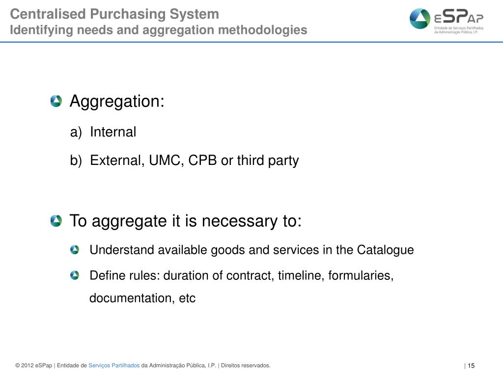 CentralisedPurchasingSystemIdentifying needs and aggregation methodologies • Aggregation: • Internal • External, UMC, CPB or third party • To aggregate it is necessary to: • Understand available goods and services in the Catalogue • Define rules: duration of contract, timeline, formularies, documentation, etc
