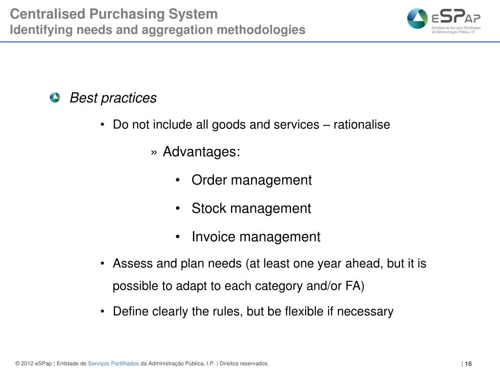 CentralisedPurchasingSystemIdentifying needs and aggregation methodologies • Best practices • Do not include all goods and services – rationalise • Advantages: • Order management • Stock management • Invoice management • Assess and plan needs (at least one year ahead, but it is possible to adapt to each category and/or FA) • Define clearly the rules, but be flexible if necessary