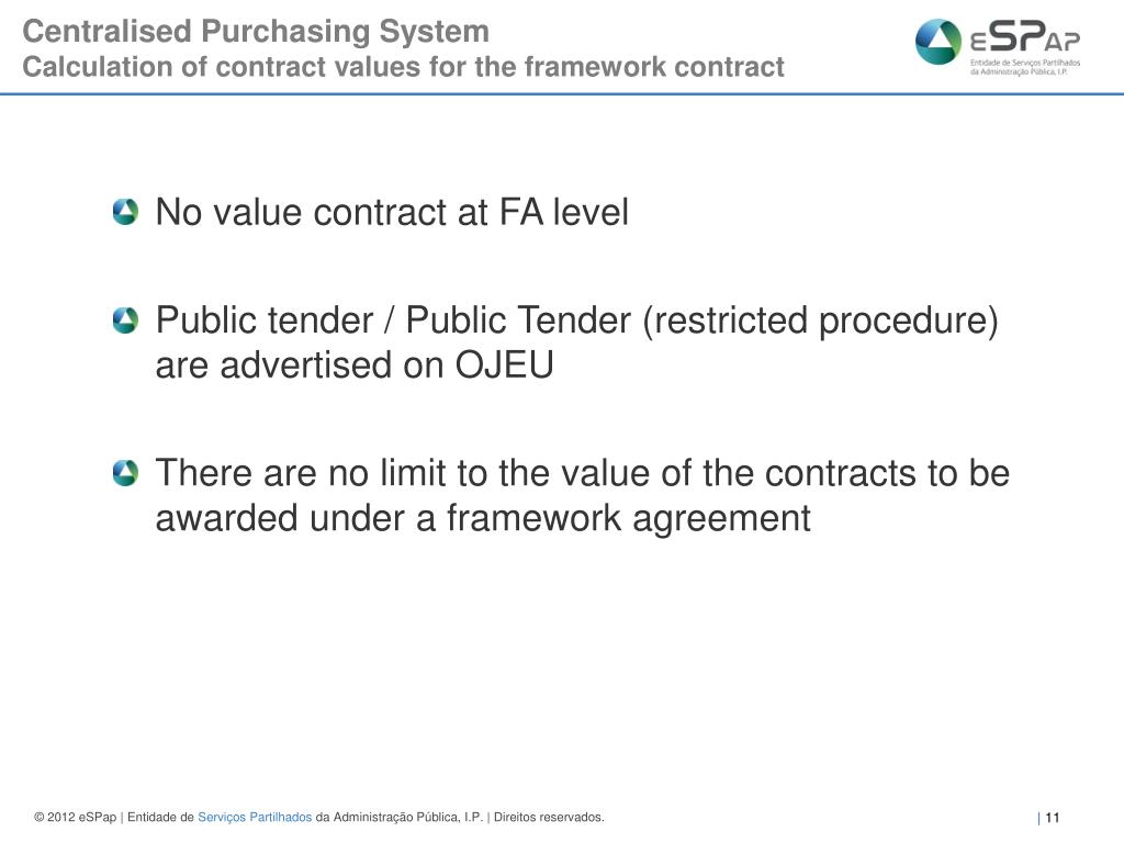 CentralisedPurchasingSystemParties to theframeworkagreement • In the contract notice eSPap identifies that all mandatory entities (State Direct Administration Services and Public Institutes) and voluntary entities (Local Authorities (Municipalities), Local Authorities’ Owned Companies, Regional Authorities and State Owned Companies) are party to the framework agreement. • Mandatory entities: + 1800 entities • Voluntary entities: around 500 .....framework agreements can only be used between the contracting authorities and the economic operators originally party to the framework agreement. When a framework agreement is to be used by several contracting authorities, therefore, these contracting authorities must be identified explicitly in the contract notice, either by naming them directly in the notice itself or through reference to other documents (e.g. the specifications or a list available from one of the contracting authorities [ ], etc.).