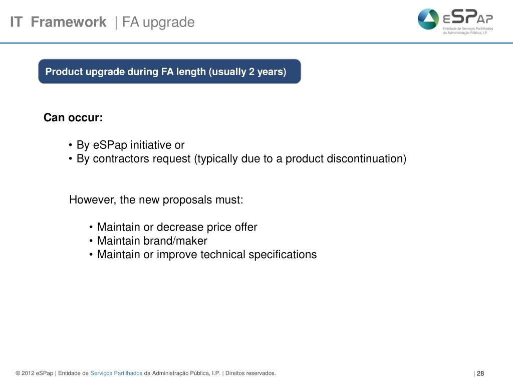 IT Framework |FA upgrade Product upgrade during FA length (usually 2 years) • Can occur: • By eSPap initiative or • By contractors request (typically due to a product discontinuation) • However, the new proposals must: • Maintain or decrease price offer • Maintain brand/maker • Maintain or improve technical specifications