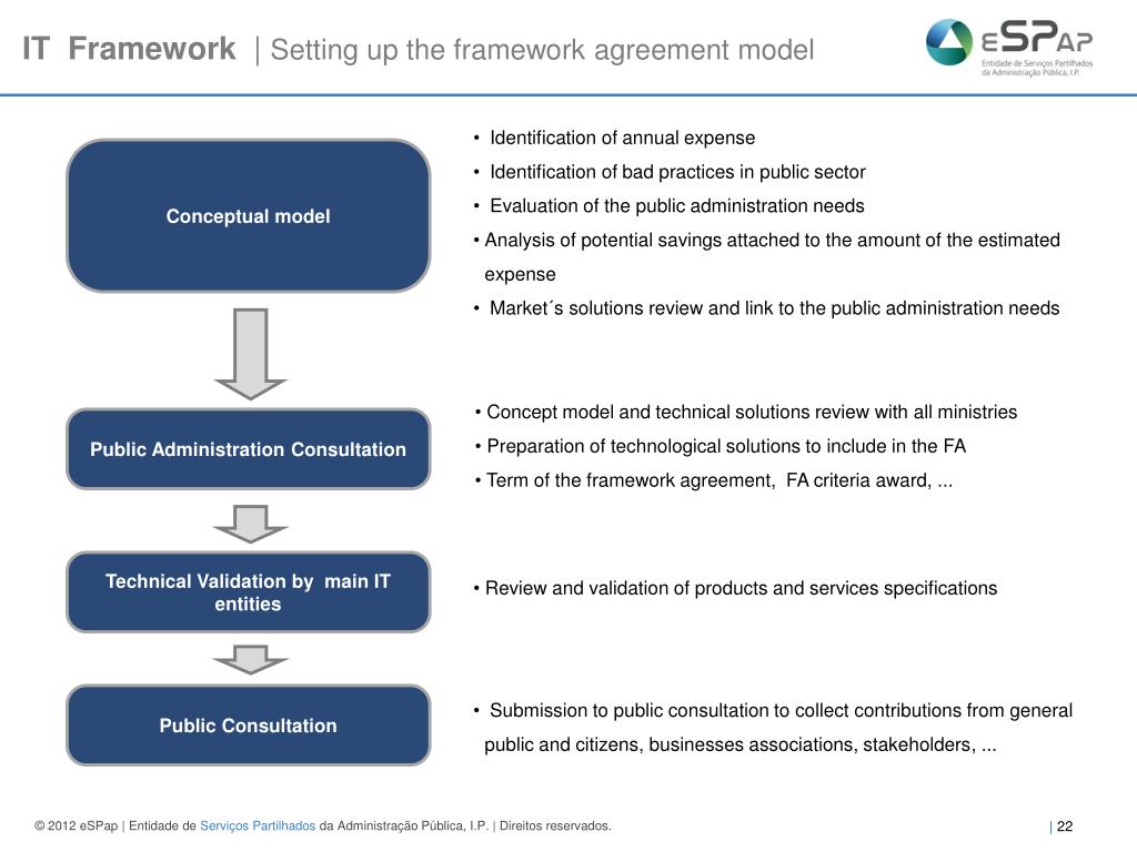 IT Framework |Setting up the framework agreement model • Identification of annual expense • Identification of bad practices in public sector • Evaluation of the public administration needs • Analysis of potential savings attached to the amount of the estimated expense • Market´s solutions review and link to the public administration needs Conceptual model • Concept model and technical solutions review with all ministries • Preparation of technological solutions to include in the FA • Term of the framework agreement, FA criteria award, ... PublicAdministrationConsultation Technical Validation by main IT entities • Review and validation of products and services specifications Public Consultation • Submission to public consultation to collect contributions from general public and citizens, businesses associations, stakeholders, ...