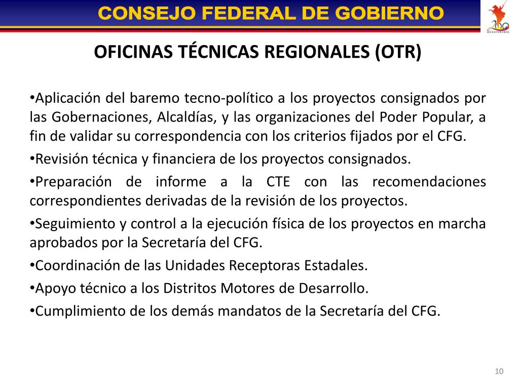 OFICINAS TÉCNICAS REGIONALES (OTR) • Aplicación del baremo tecno-político a los proyectos consignados por las Gobernaciones, Alcaldías, y las organizaciones del Poder Popular, a fin de validar su correspondencia con los criterios fijados por el CFG. • Revisión técnica y financiera de los proyectos consignados. • Preparación de informe a la CTE con las recomendaciones correspondientes derivadas de la revisión de los proyectos. • Seguimiento y control a la ejecución física de los proyectos en marcha aprobados por la Secretaría del CFG. • Coordinación de las Unidades Receptoras Estadales. • Apoyo técnico a los Distritos Motores de Desarrollo. • Cumplimiento de los demás mandatos de la Secretaría del CFG.
