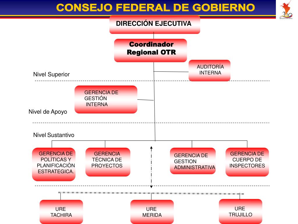 DIRECCIÓN EJECUTIVA Coordinador Regional OTR AUDITORÍA INTERNA Nivel Superior GERENCIA DE GESTIÓN INTERNA Nivel de Apoyo NivelSustantivo GERENCIA DE POLÌTICAS Y PLANIFICACIÒN ESTRATEGICA. GERENCIA TÉCNICA DE PROYECTOS GERENCIA DE CUERPO DE INSPECTORES GERENCIA DE GESTION ADMINISTRATIVA URE TRUJILLO URE TACHIRA URE MERIDA