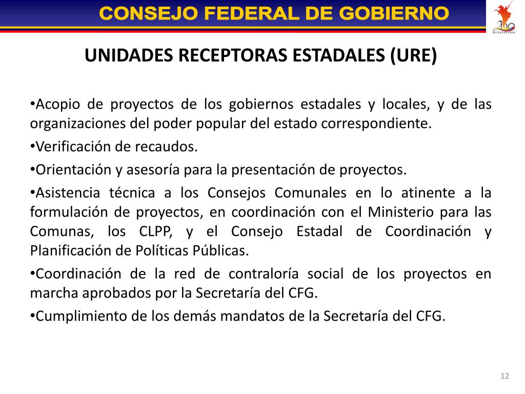 UNIDADES RECEPTORAS ESTADALES (URE) • Acopio de proyectos de los gobiernos estadales y locales, y de las organizaciones del poder popular del estado correspondiente. • Verificación de recaudos. • Orientación y asesoría para la presentación de proyectos. • Asistencia técnica a los Consejos Comunales en lo atinente a la formulación de proyectos, en coordinación con el Ministerio para las Comunas, los CLPP, y el Consejo Estadal de Coordinación y Planificación de Políticas Públicas. • Coordinación de la red de contraloría social de los proyectos en marcha aprobados por la Secretaría del CFG. • Cumplimiento de los demás mandatos de la Secretaría del CFG.