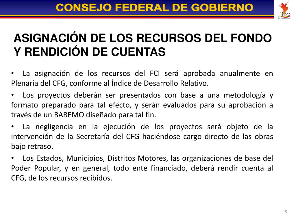 ASIGNACIÓN DE LOS RECURSOS DEL FONDO Y RENDICIÓN DE CUENTAS La asignación de los recursos del FCI será aprobada anualmente en Plenaria del CFG, conforme al Índice de Desarrollo Relativo. Los proyectos deberán ser presentados con base a una metodología y formato preparado para tal efecto, y serán evaluados para su aprobación a través de un BAREMO diseñado para tal fin. La negligencia en la ejecución de los proyectos será objeto de la intervención de la Secretaría del CFG haciéndose cargo directo de las obras bajo retraso. Los Estados, Municipios, Distritos Motores, las organizaciones de base del Poder Popular, y en general, todo ente financiado, deberá rendir cuenta al CFG, de los recursos recibidos.