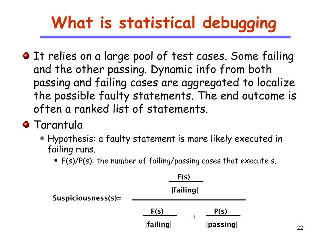 What is statistical debugging It relies on a large pool of test cases. Some failing and the other passing. Dynamic info from both passing and failing cases are aggregated to localize the possible faulty statements. The end outcome is often a ranked list of statements. Tarantula Hypothesis: a faulty statement is more likely executed in failing runs. F(s)/P(s): the number of failing/passing cases that execute s. F(s) |failing| Suspiciousness(s)= F(s) P(s) + |failing| |passing|