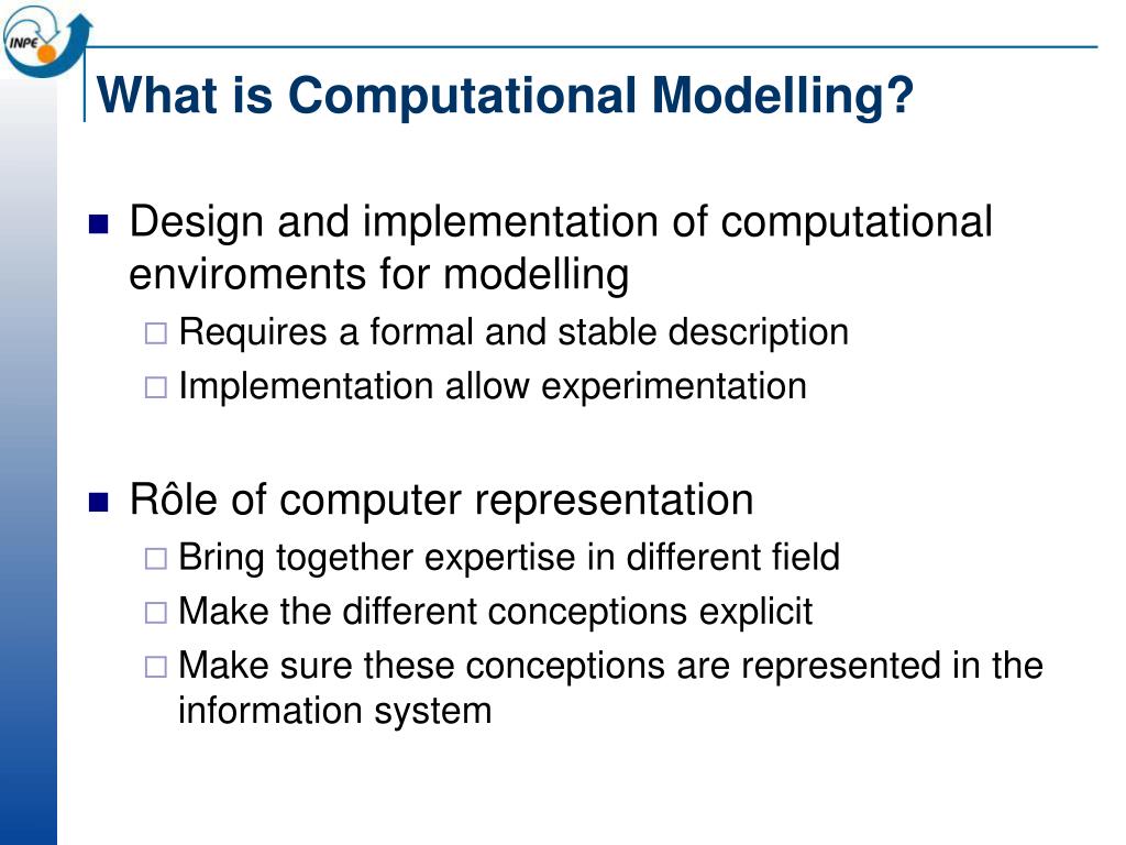 What is Computational Modelling? • Design and implementation of computational enviroments for modelling • Requires a formal and stable description • Implementation allow experimentation • Rôle of computer representation • Bring together expertise in different field • Make the different conceptions explicit • Make sure these conceptions are represented in the information system